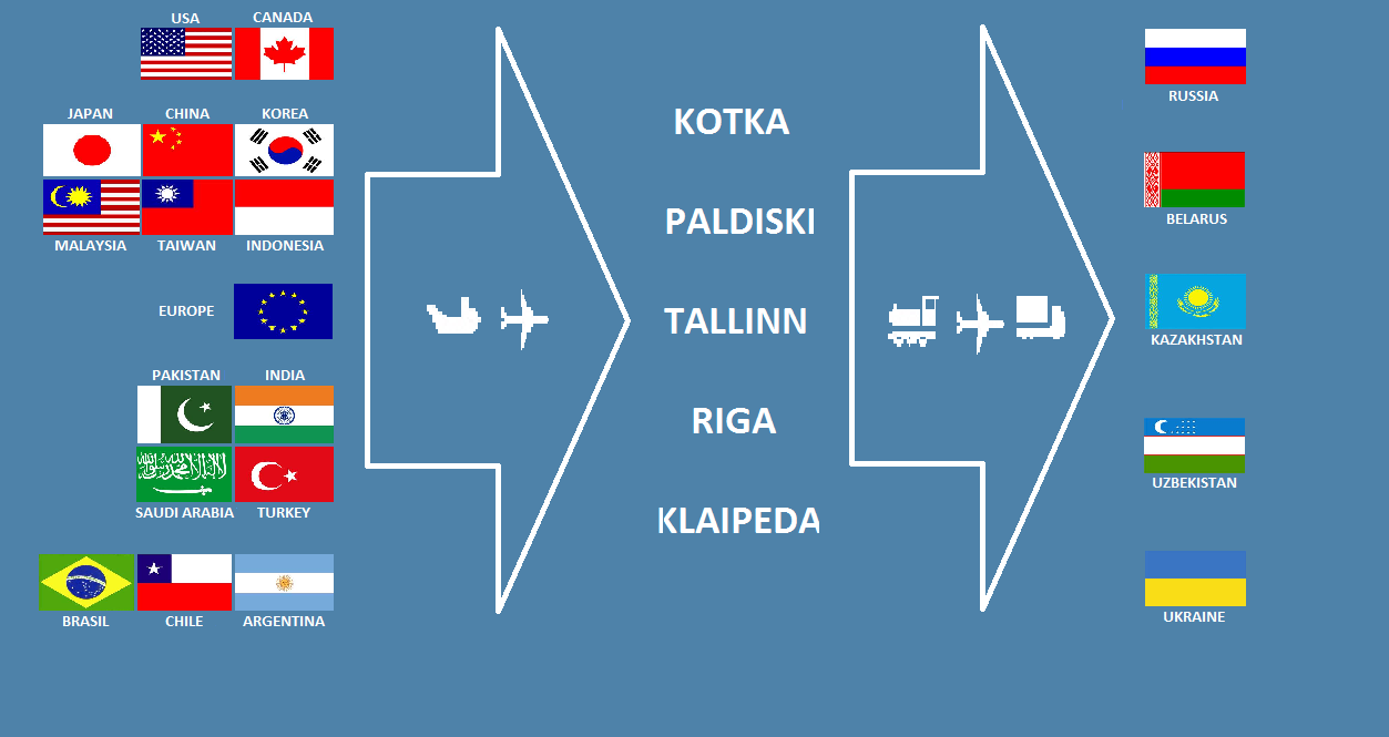 We use the following transit ports depending on the task and the final destination: - Riga; - Klaipeda; - Tallinn; - Kotka; - Hamina; - Paldisk; - Bremerhaven; - Antwerp.